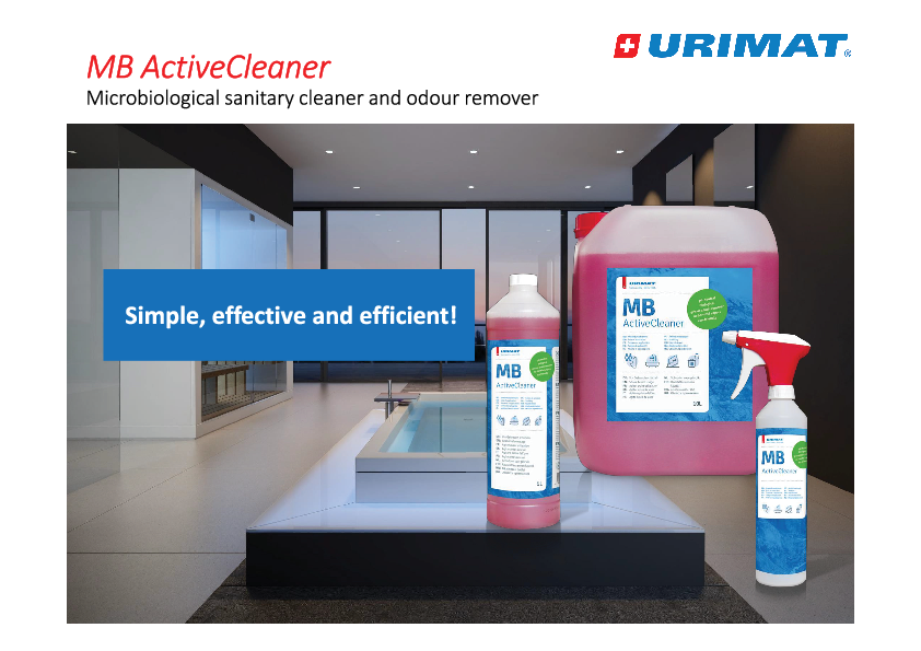 pH-neutral, biological and sustainableThe dermatologically tested MB-ActiveCleaner which has been rated as ‘very good’ prevents unpleasant odors due to the decomposition of organic matter. It is particularly suitable for maintenance cleaning and odour elimination in heavily frequented sanitary areas.