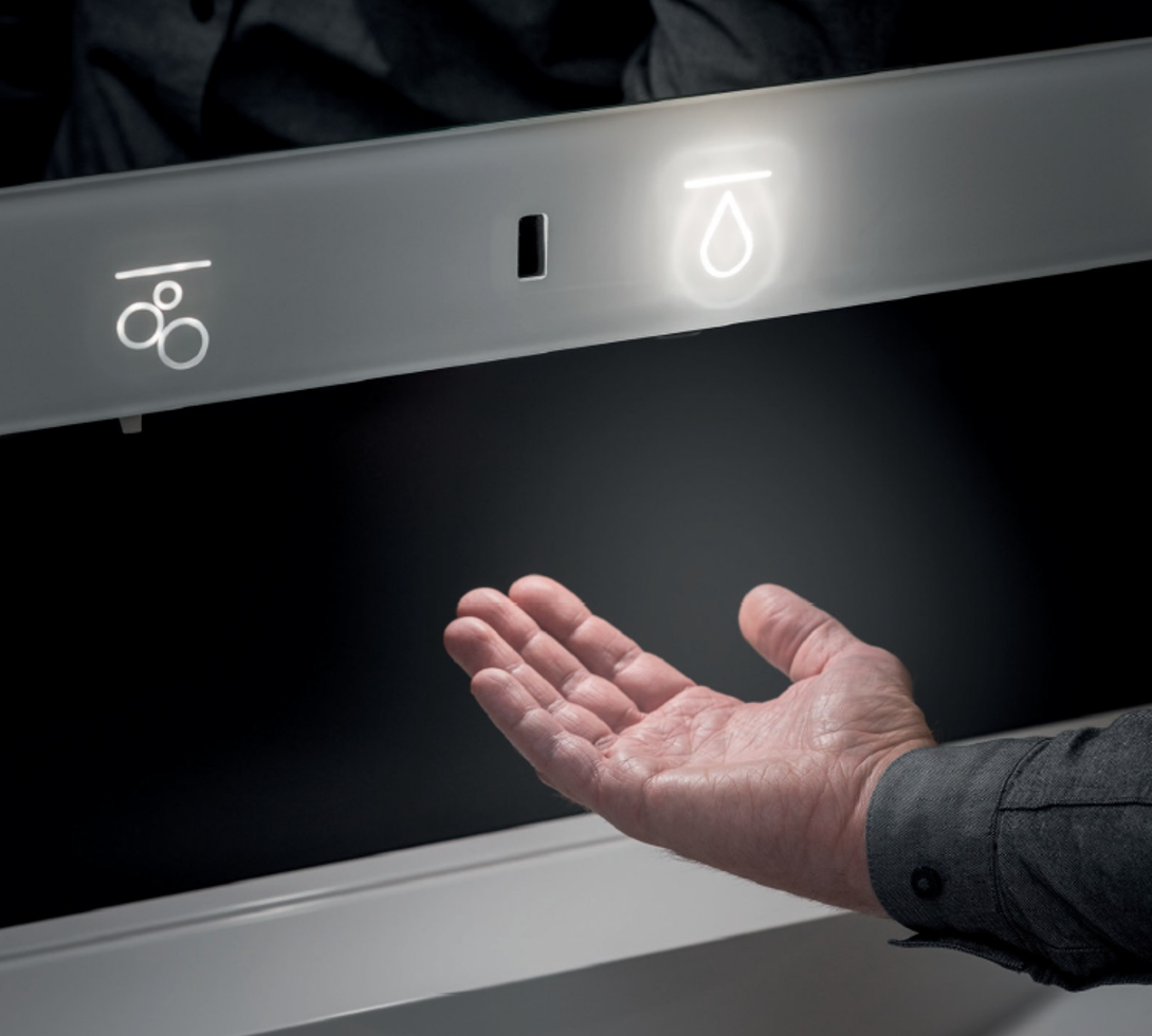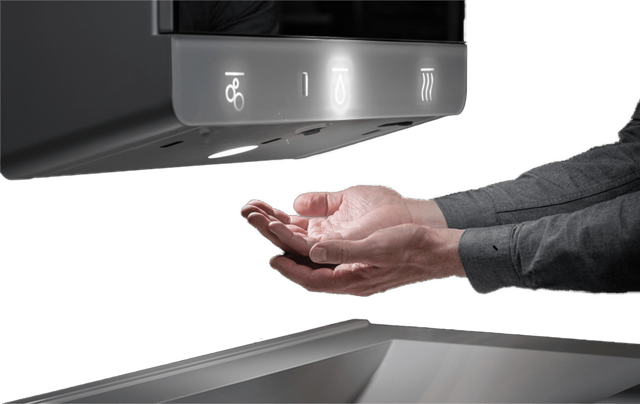 Hygienic and intuitive operation through completely touchless activation of water, soap and air.
