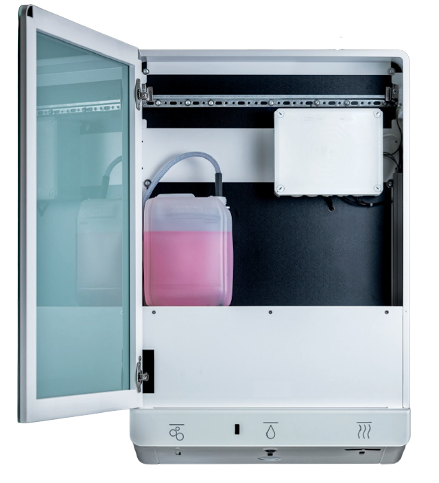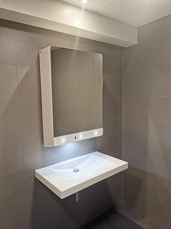 The advantages that countInstead of four different product (mirror, soap dispenser, water tap, hand dryer or towel dispenser) that you have to buy, transport and install and after installation servicing, you will only havbe to order and install one complete product. This saves you time and money. For the cleaning and maintenance personal, there is only one mirror cabinet that has to be opened and soap or paper towels can be refilled. Standard soap dispenser have a tank volume of 1l to max. 2l; the 5l soap tank of the FX-M will more than double the frequency of use. There are no grooves or joints on the washbasin, making cleaning easy and hygienic. All this again saves you resources and assures a positive user experience.